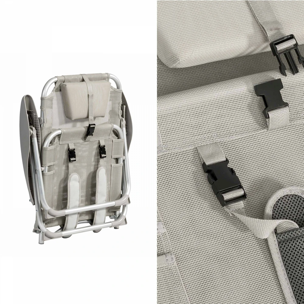 ce fauteuil de plage malin vous accompagne pour toutes vos sorties à la mer. Portez-le en sac à dos grâce à ses 2 bretelles rembourrées intégrées, dépliez-le et installez-vous confortablement. La chaise de plage possède un dossier inclinable en 4 positions sur un simple mouvement des accoudoirs. Sa toile respirante en textilène et son coussin repose-tête la rendent très agréable. Pratique, elle comprend une pochette de rangement à l’arrière du dossier et une poche secrète dans le repose-tête pour glisser vos objets de valeur. La toile résiste aux agressions extérieures (eau, sel, sable) et conserve l’éclat de sa couleur dans le temps. Sa structure en aluminium est solide et durable. Lorsqu’il est plié, dimensions du fauteuil : hauteur 69 x largeur 58 x épaisseur 11cm. Poids du fauteuil à l’unité : 3,2kg. La chaise de plage se décline en 5 couleurs : bleu, bleu clair, corail, gris, rose