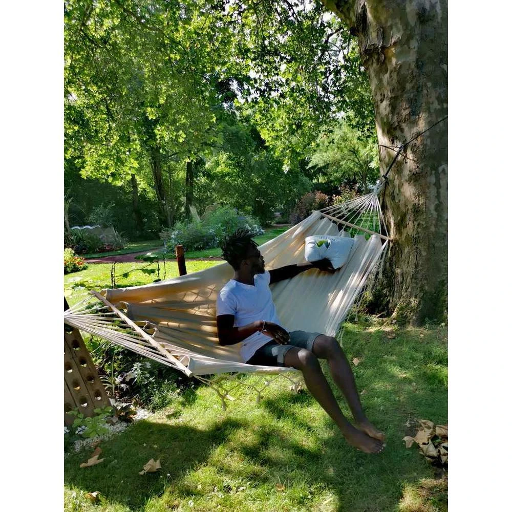 Hamac à franges du Brésil, taille de la toile 140×200, 100% coton, barres bois de 78,5 cm