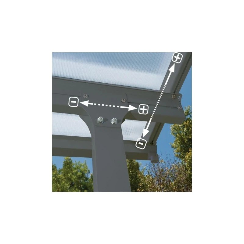 – Poteaux ajustables : hauteur de faitage modulable de 206 à 305cm, la distance entre les poteaux et le mur peut être ajustée entre 226 et 286cm, les poteaux peuvent être décalés latéralement de 50 cm.