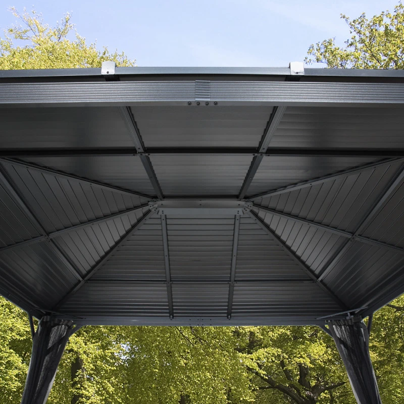 Cette pergola est dotée d’une toiture solide constituée de tôles en acier galvanisé aux rayures horizontales, rappelant un agencement harmonieux d’ardoises de la même couleur que la structure. Ce produit de grande qualité vous est proposé par le spécialiste canadien des constructions de jardin, Sojag. Habitués des conditions climatiques sévères, tous leurs abris sont conçus pour résister durablement aux intempéries : neige, pluie ou soleil. La toiture peut soutenir une charge de neige impressionnante de 125kg/m² et le revêtement par thermolaquage ainsi que la toiture galvanisée ne craignent aucunement la corrosion.