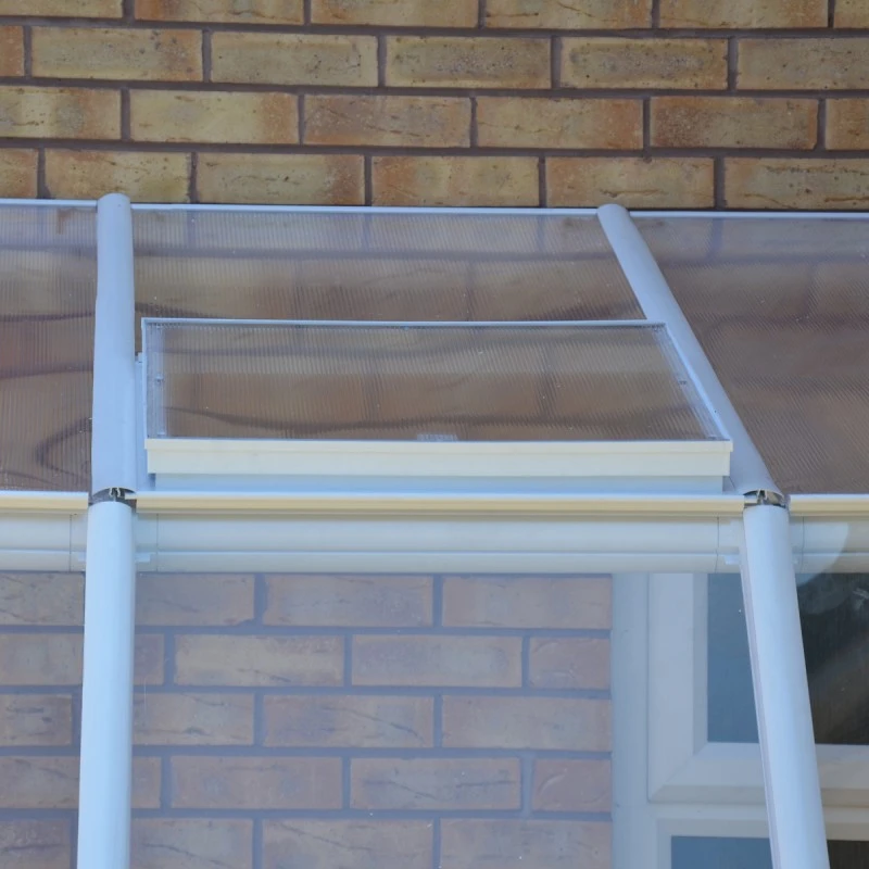 La porte sur charnières, d’une largeur de 58cm pour une hauteur de 185,5cm et la lucarne de ventilation vous permettront de gérer au mieux les flux d’air en période chaude. Supportant des vents de 90km/h et une charge de neige admissible maximale de 75kg/m², cette véranda adossée se monte en peu de temps et sera là pour durer !